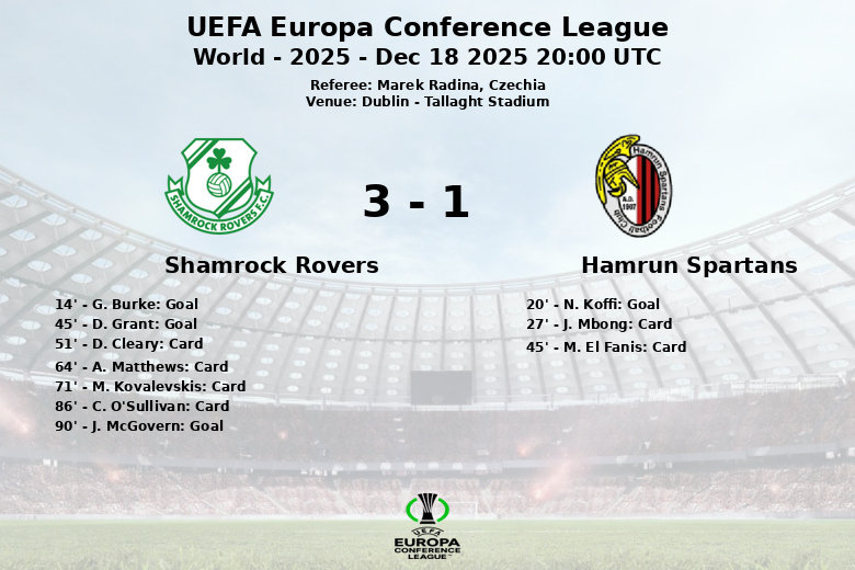 Dublín, 18 de diciembre de 2025 – El Shamrock Rovers se impuso al Hamrun Spartans en el Tallaght Stadium en un partido correspondiente a la UEFA Europa Conference League que estuvo marcado por la intensidad y la disciplina. Los Rovers dominaron la posesión con un 59% frente al 41% del Hamrun, reflejando su superioridad en el juego.