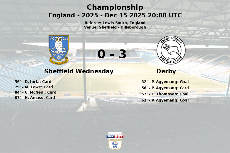 El partido se encendió en el minuto 32 con un gol de P. Agyemang, asistido por B. Clark, que puso en ventaja al Derby. El Sheffield Wednesday no lograba encontrar respuestas a pesar de su control del balón. La tensión aumentó en el segundo tiempo, con tarjetas amarillas para D. Iorfa y P. Agyemang en el minuto 56. Tan solo un minuto después, L. Thompson amplió la ventaja para el Derby, asistido por M. Clarke. Agyemang volvió a marcar en el minuto 62, aumentando la ventaja para el Derby. El Sheffield Wednesday acumuló un total de cuatro tarjetas amarillas durante el encuentro, demostrando la frustración del equipo ante el juego del Derby. Mientras que el Derby, con un juego más directo, consiguió capitalizar sus oportunidades y llevarse la victoria. El Sheffield Wednesday genero un corner y acumulo 10 faltas contra 5 corners y 8 faltas del Derby.