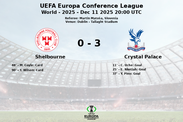 El partido, arbitrado por Martin Matoša de Eslovenia, vio dos tarjetas amarillas para el Shelbourne, mostradas a M. Coyle y T. Wilson, mientras que el Crystal Palace mantuvo una disciplina impecable sin recibir amonestaciones.