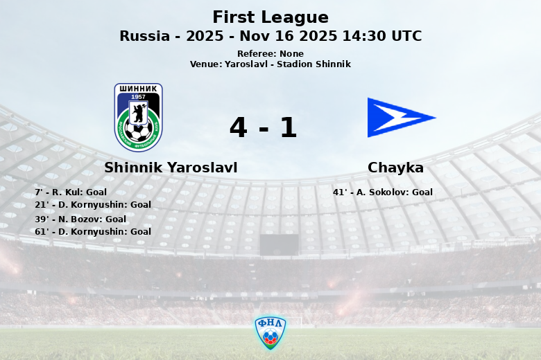 Yaroslavl fue testigo de una contundente victoria del Shinnik Yaroslavl sobre el Chayka, en un partido correspondiente a la First League rusa. Desde el pitido inicial, el Shinnik impuso su ritmo, abriendo el marcador tempranamente al minuto 7 gracias a un gol de R. Kul. La superioridad local se materializó con un segundo tanto de D. Kornyushin al minuto 21, ampliando la ventaja. Antes del descanso, N. Bozov añadió un tercer gol para el Shinnik al minuto 39. El Chayka logró descontar al minuto 41 mediante A. Sokolov, dando esperanzas a sus aficionados. Sin embargo, la segunda mitad vio al Shinnik reafirmar su dominio. D. Kornyushin volvió a anotar al minuto 61, sellando la victoria para el equipo local. El partido se caracterizó por un juego intenso, pero sin tarjetas, ni amarillas ni rojas, para ninguno de los dos equipos. A pesar de no contar con datos precisos sobre posesión, tiros a puerta o fueras, corners y faltas cometidas, el marcador final refleja la clara superioridad del Shinnik Yaroslavl en este encuentro.
