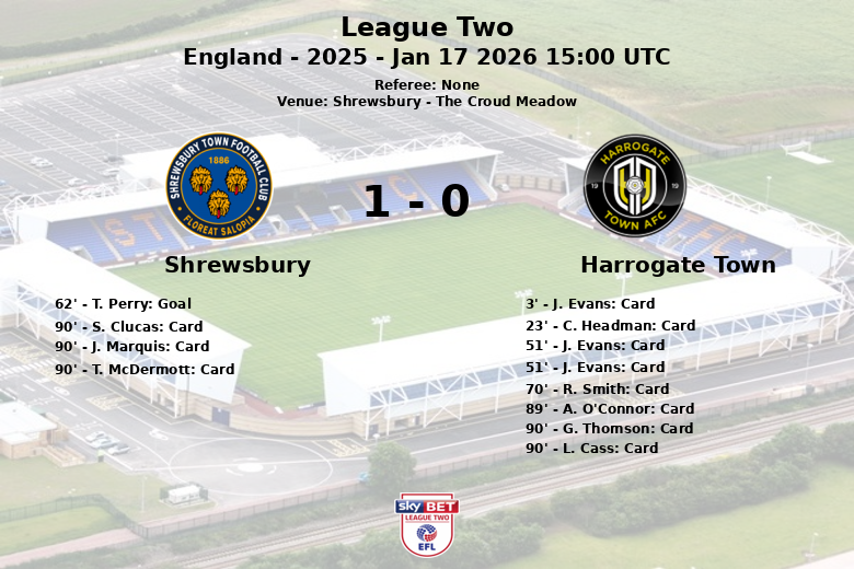 A pesar de jugar con un hombre menos, el Harrogate Town intentó resistir, pero la presión del Shrewsbury finalmente dio sus frutos. En el minuto 62, T. Perry anotó el único gol del partido para el Shrewsbury, con una asistencia de J. Ruffels, lo que dio la ventaja definitiva al equipo local.