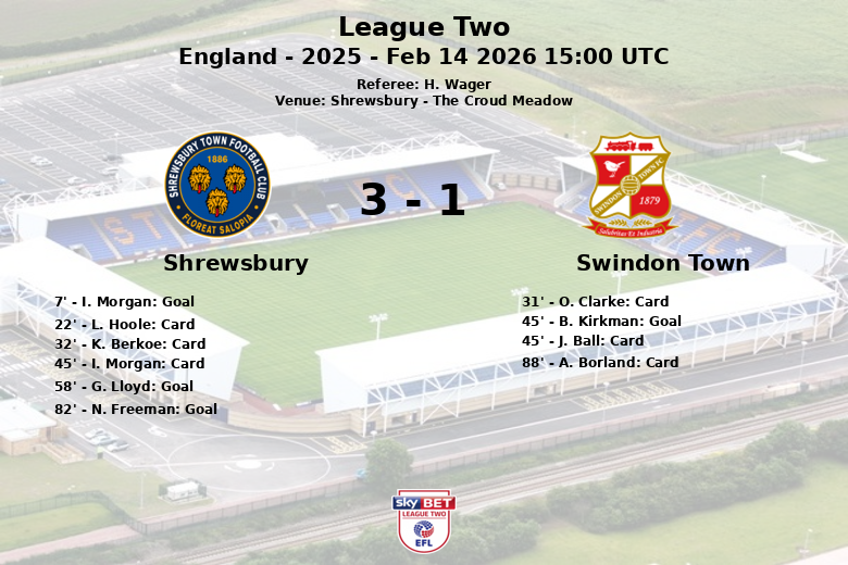 Shrewsbury, Inglaterra – El Shrewsbury se llevó la victoria en casa ante el Swindon Town en un encuentro de la League Two disputado en The Croud Meadow. El partido, arbitrado por H. Wager, se caracterizó por su intensidad y las numerosas tarjetas amarillas mostradas a ambos equipos.