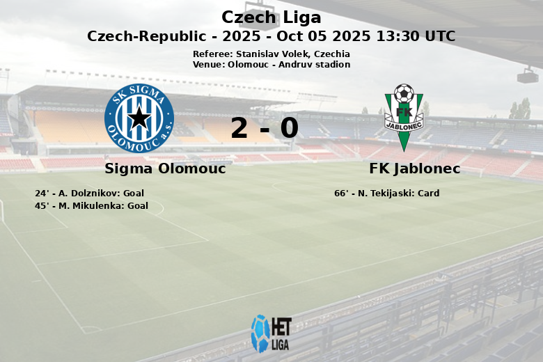 Olomouc, República Checa – En un partido disputado en el Andruv stadion, el Sigma Olomouc se impuso al FK Jablonec con una victoria contundente. El equipo local, con un 44% de posesión, supo aprovechar sus oportunidades, marcando dos goles cruciales en la primera mitad. A. Dolznikov abrió el marcador en el minuto 24, asistido por M. Hadas, seguido por un gol de M. Mikulenka justo antes del descanso, nuevamente con asistencia de M. Hadas.