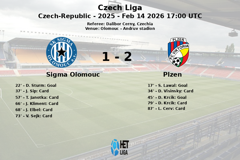 Olomouc, República Checa – En un encuentro disputado en el Andruv stadion, el Plzen se impuso al Sigma Olomouc en un partido que mantuvo a los aficionados al borde de sus asientos. El partido, correspondiente a la jornada 22 de la Liga Checa, temporada 2025, se caracterizó por su intensidad y un elevado número de tarjetas amarillas.