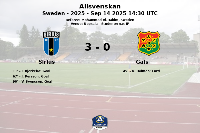 En la segunda mitad, el Sirius amplió su ventaja al minuto 67 con un gol de J. Persson, asistido por O. Krusnell, consolidando su control sobre el partido. A pesar de los esfuerzos del GAIS por reaccionar, la defensa del Sirius se mantuvo sólida y organizada. Ya en el tiempo añadido, al minuto 90, V. Svensson selló la victoria con un tercer gol para el Sirius, sin asistencia.