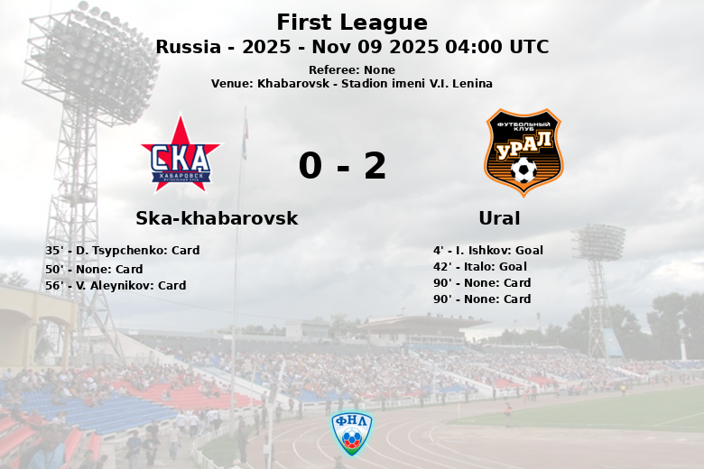 Khabarovsk, Rusia – En un encuentro disputado en el Stadion imeni V.I. Lenina, el Ural se impuso con autoridad al Ska-Khabarovsk en partido correspondiente a la jornada 18 de la First League. El partido, celebrado el 9 de noviembre de 2025, vio al Ural tomar la delantera temprano, al minuto 4, gracias a un gol de I. Ishkov, tras una jugada sin asistencia aparente. La primera mitad también incluyó una tarjeta amarilla para D. Tsypchenko del Ska-Khabarovsk al minuto 35.