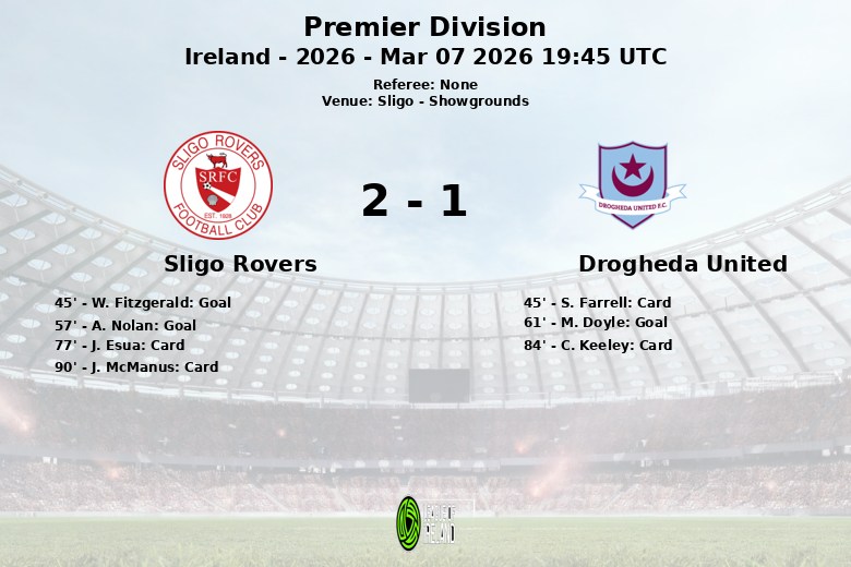 El marcador se abrió justo antes del descanso, en el minuto 45, con un gol de W. Fitzgerald para el Sligo Rovers. La alegría local se prolongó hasta el minuto 57, cuando A. Nolan amplió la ventaja. Sin embargo, el Drogheda United no se rindió y descontó en el minuto 61 con un penal convertido por M. Doyle.