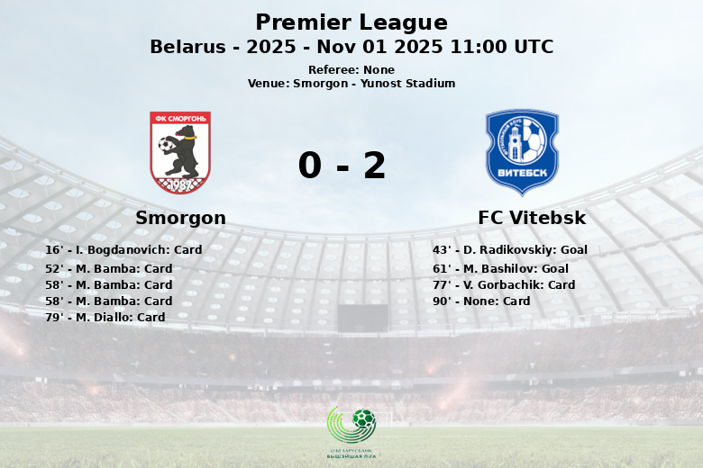 Smorgon, Bielorrusia – En un encuentro disputado en el Yunost Stadium de Smorgon, FC Vitebsk se llevó la victoria en un partido correspondiente a la fecha 27 de la Premier League bielorrusa, temporada 2025. El partido, marcado por la intensidad y la disciplina, vio al FC Vitebsk tomar la delantera en el minuto 43 gracias a un gol de D. Radikovskiy, asistido por E. Krasnov.