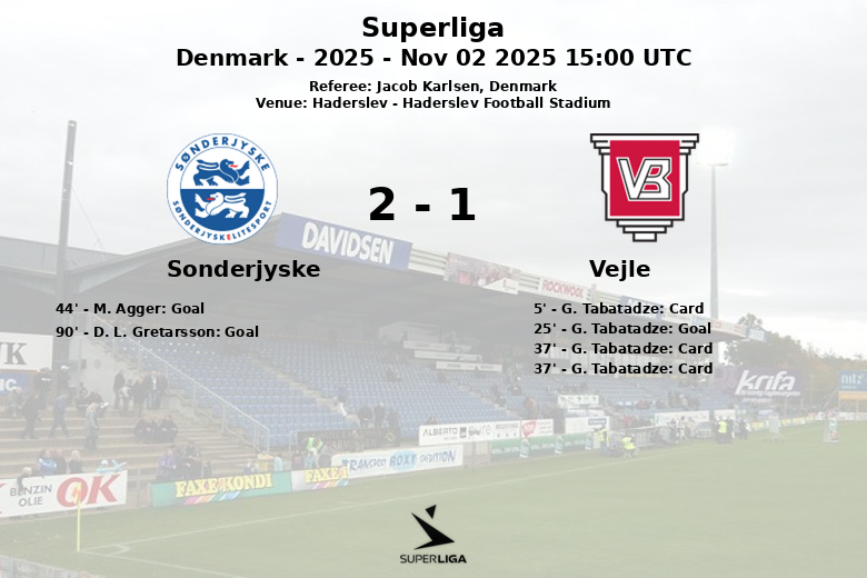 A pesar de jugar con inferioridad numérica, el Vejle se defendió con garra. No obstante, el Sonderjyske, dominador absoluto de la posesión (79% frente al 21% del Vejle), logró igualar el marcador en el minuto 44 gracias a un gol de M. Agger, asistido por K. M. Ingason.