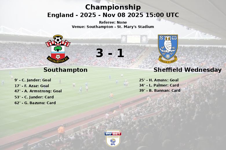 Sheffield Wednesday reaccionó con un gol de H. Amass al minuto 25, acortando distancias y metiendo presión al Southampton. Sin embargo, Southampton retomó el control en la segunda mitad con un gol de A. Armstrong al minuto 47, estableciendo una ventaja que, a la postre, sería definitiva.