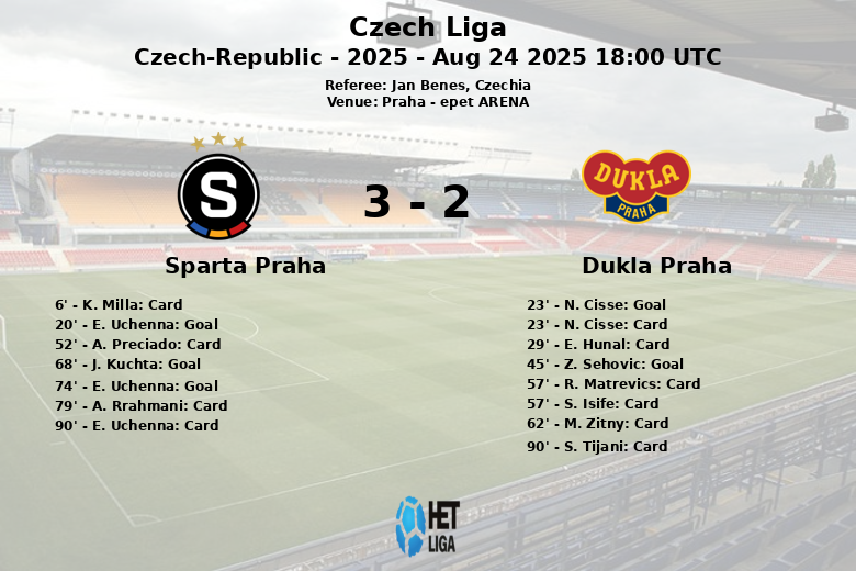 Praha, 24 de agosto de 2025 – El Sparta Praha se impuso al Dukla Praha en un encuentro disputado en el epet ARENA, correspondiente a la jornada 6 de la Liga Checa. El partido, arbitrado por Jan Benes, se caracterizó por una clara superioridad del Sparta en la posesión del balón (78%) y una notable cantidad de tarjetas amarillas mostradas a ambos equipos.