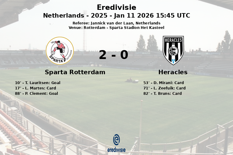 Rotterdam, Países Bajos – En un partido correspondiente a la jornada 18 de la Eredivisie, el Sparta Rotterdam venció al Heracles con un marcador de 2 a 0 en el Sparta Stadion Het Kasteel. El encuentro, arbitrado por Jannick van der Laan, se caracterizó por un alto ritmo y momentos de tensión.