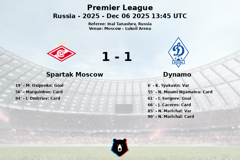 El encuentro estuvo plagado de interrupciones y decisiones controvertidas. Un gol de K. Tyukavin para el Dynamo fue anulado por el VAR al minuto 6, y un gol de N. Marichal para el Dynamo al minuto 85, también por el VAR. El árbitro, Inal Tanashev, mostró cuatro tarjetas amarillas en total: dos para el Dynamo (N. Moumi Ngamaleu y J. Caceres y N. Marichal) y dos para el Spartak (Marquinhos e I. Dmitriev). El Spartak cometió más faltas (20) que el Dynamo (17), lo que refleja la intensidad del juego. El Dynamo tuvo menos tiros de esquina (2) que el Spartak (5)