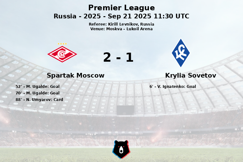 El Spartak logró igualar el marcador en el minuto 52 con un gol de M. Ugalde, asistido por N. Umyarov. Ugalde volvió a marcar en el minuto 70, esta vez con asistencia de Marquinhos, poniendo al Spartak en ventaja. A pesar del esfuerzo del Spartak, que realizó 25 tiros al arco, incluyendo 9 que exigieron al portero rival, el Krylia Sovetov logró mantener el empate.