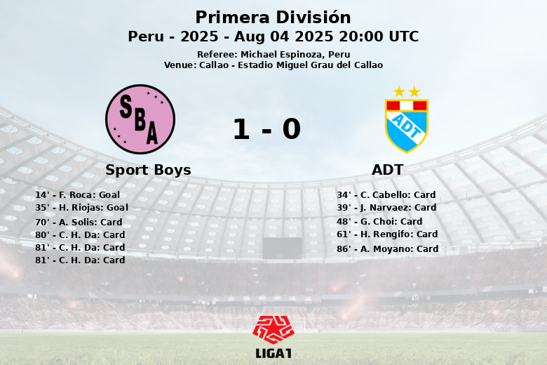 Callao, Perú – En un encuentro disputado en el Estadio Miguel Grau del Callao, Sport Boys logró una trabajada victoria ante ADT en la cuarta jornada del Clausura de la Primera División Peruana. El partido, dirigido por Michael Espinoza, estuvo cargado de tensión y tarjetas.