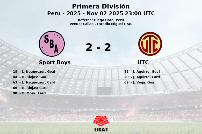 UTC abrió el marcador tempranamente al minuto 12 con un gol de J. Aguirre, asistido por J. Vega. Sin embargo, Sport Boys respondió rápidamente con un gol de penal de L. Nequecaur al minuto 18. El partido continuó siendo intenso y H. Riojas anotó para Sport Boys al minuto 44, dándole la ventaja a su equipo antes del descanso.