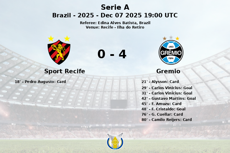 En un encuentro disputado en el estadio Ilha do Retiro de Recife, Gremio demostró su superioridad al vencer a Sport Recife con una sólida actuación. El partido, correspondiente a la jornada 38 de la Serie A brasileña, fue arbitrado por Edina Alves Batista.