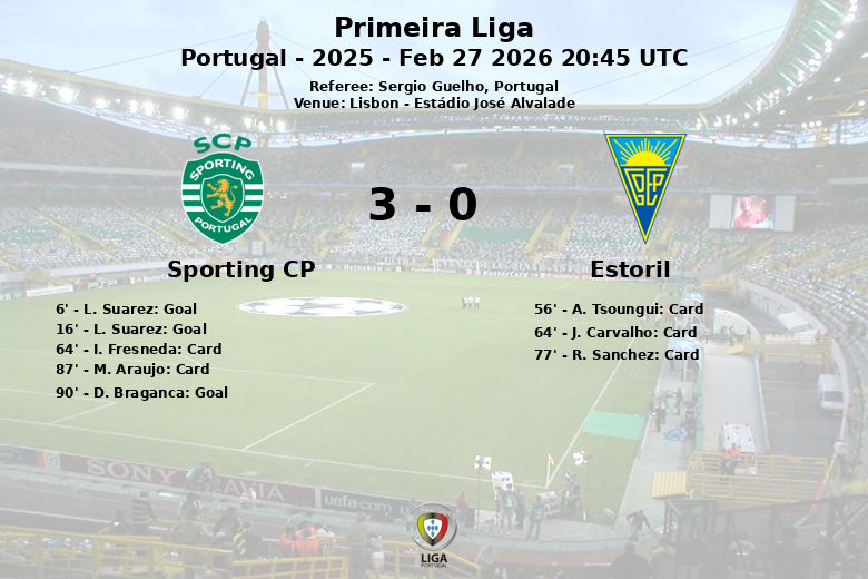 El Sporting continuó presionando y sentenció el partido en el minuto 90 con un gol de D. Braganca, asistido por N. Santos, sellando una victoria convincente. El partido también estuvo marcado por varias tarjetas amarillas, con dos para el Sporting (I. Fresneda y M. Araujo) y tres para el Estoril (A. Tsoungui, J. Carvalho y R. Sanchez). A pesar de las numerosas faltas cometidas por el Estoril (16), no lograron desestabilizar el juego del Sporting, que sumó tres puntos importantes en su búsqueda por el título de liga.