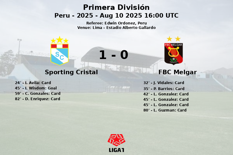 La situación se volvió aún más crítica para Melgar al final de la primera mitad, cuando L. Gonzalez vio la segunda tarjeta amarilla y, consecuentemente, la roja, dejando a su equipo con nueve jugadores. Justo después de esta expulsión, I. Wisdom aprovechó para adelantar al Sporting Cristal con un gol que, a la postre, sería el único del partido.