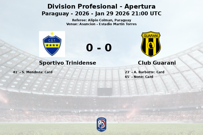 Asunción, Paraguay – En un encuentro disputado en el Estadio Martín Torres, Sportivo Trinidense y Club Guaraní empataron 0-0 en la segunda jornada del Apertura de la División Profesional. El partido, arbitrado por Alipio Colman, se caracterizó por una alta posesión del balón a favor del Club Guaraní (67%), aunque sin poder traducirlo en goles.