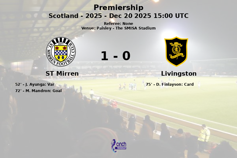 El partido estuvo marcado por un gol anulado al ST Mirren en el minuto 52 tras la revisión del VAR por una falta. La tensión se mantuvo hasta el minuto 72, cuando M. Mandron logró romper el empate para el ST Mirren, asistido por D. John. El Livingston recibió una tarjeta amarilla en el minuto 75 para D. Finlayson. A pesar de los esfuerzos del Livingston por revertir el marcador, el ST Mirren supo mantener la ventaja hasta el final del partido. El equipo local tuvo 7 saques de esquina contra 3 del Livingston y cometieron menos faltas, 9 contra 12 del Livingston.