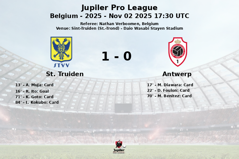 El gol de R. Ito en el minuto 16, asistido por A. Sissako, marcó la diferencia en el marcador. El partido se vio condicionado por la tarjeta roja mostrada a D. Foulon en el minuto 22, dejando al Antwerp en inferioridad numérica durante gran parte del encuentro. La intensidad del juego se reflejó en las múltiples tarjetas mostradas, con tres amarillas para el St. Truiden y dos amarillas y una roja para el Antwerp. El St. Truiden aprovechó su superioridad en el campo para generar un mayor número de corners (6) en comparación con el Antwerp (4). A pesar de las 12 faltas cometidas por cada equipo, el St. Truiden logró mantener el control del partido y asegurar la victoria. El árbitro Nathan Verboomen tuvo una tarde ajetreada en este encuentro de la temporada 2025 de la Jupiler Pro League.