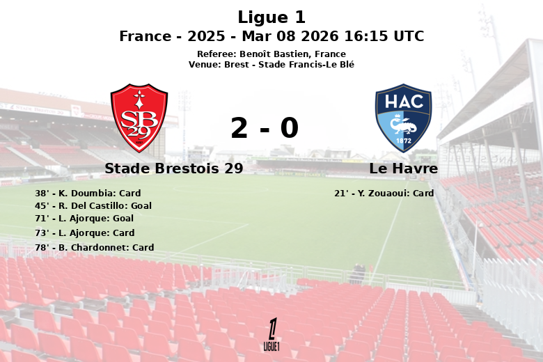 Brest, Francia – En un encuentro disputado en el Stade Francis-Le Blé, el Stade Brestois 29 venció a Le Havre con un marcador de 2 a 0. A pesar de una mayor posesión del balón por parte de Le Havre (59% frente al 41% de Brest), los locales fueron más efectivos de cara al arco.