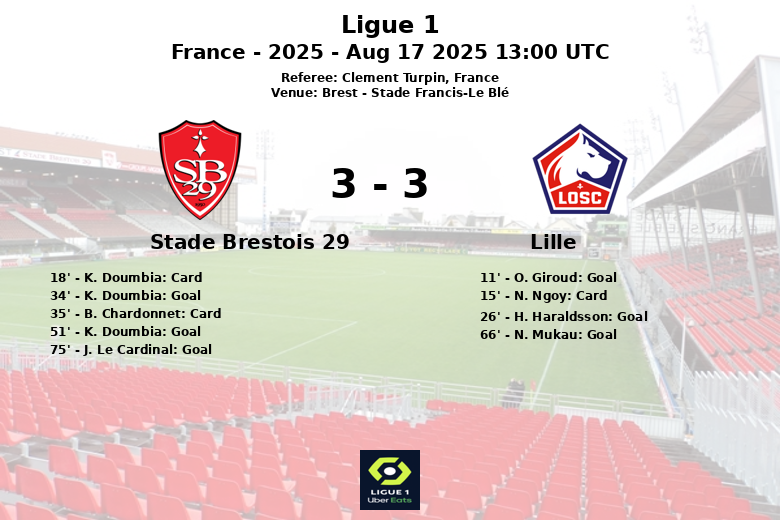 El Lille tomó la delantera temprano con goles de O. Giroud en el minuto 11 y H. Haraldsson en el 26. Sin embargo, K. Doumbia del Stade Brestois 29 respondió con un gol en el minuto 34, demostrando la capacidad ofensiva del equipo local.