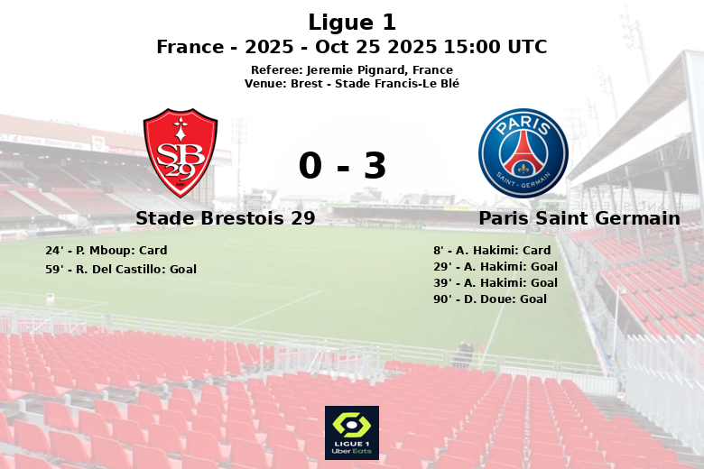 En los últimos minutos, el PSG selló la victoria con un gol de D. Doue en el minuto 90, asistido por W. Zaire-Emery. El partido concluyó con una victoria clara para el PSG, demostrando su superioridad en la Ligue 1. El Brestois cometió 9 faltas y vio una tarjeta amarilla (P. Mboup, min 24), mientras que el PSG cometió también 9 faltas y A. Hakimi recibió una amarilla al minuto 8. El PSG genero 16 tiros y el Stade Brestois 8.