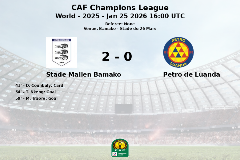 El partido comenzó de forma equilibrada, pero la balanza se inclinó a favor del Stade Malien en el minuto 54 con un gol de T. Nkeng, asistido por M. Traore. Pocos minutos después, en el 59, M. Traore amplió la ventaja con un gol propio, asistido esta vez por O. Coulibaly. El Stade Malien supo defender su ventaja a pesar de la presión del Petro de Luanda, que solo logró un tiro a puerta en todo el partido. El equipo maliense mostró una mayor precisión en sus ataques, con seis tiros a puerta de un total de doce. Un tarjeta amarilla fue mostrado al jugador local D. Coulibaly al minuto 41. El partido concluyó con el Stade Malien llevándose una merecida victoria.