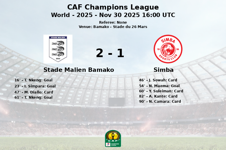 Aunque el Simba tuvo mayor posesión (67%), no logró traducirlo en goles hasta el minuto 54, cuando N. Maema descontó en el marcador. Sin embargo, el Stade Malien se mantuvo firme en defensa. Nkeng tuvo la oportunidad de aumentar la ventaja en el minuto 61 pero falló un penalti. El partido se tensó en los minutos finales, con tarjetas amarillas para J. Sowah, Y. Suleiman y N. Camara del Simba, y para M. Diallo del Stade Malien. La situación se complicó aún más para el Simba cuando A. Kante recibió una tarjeta roja en el minuto 82.