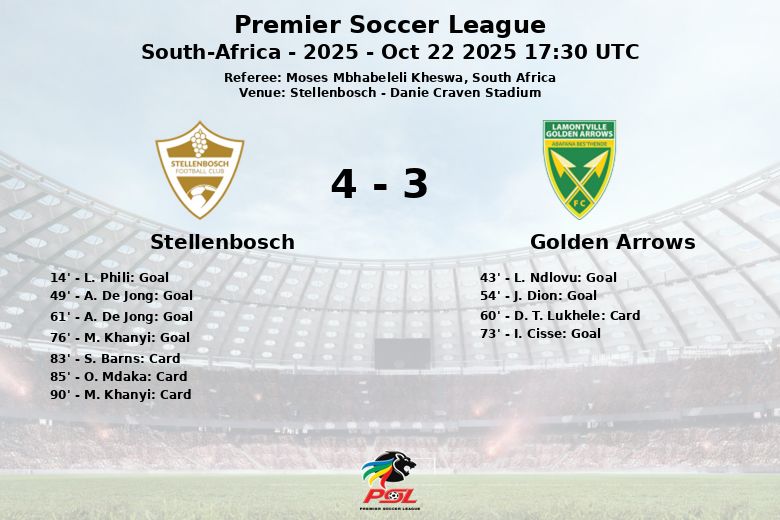 Stellenbosch abrió el marcador temprano, al minuto 14, con un gol de L. Phili asistido por D. Titus. Sin embargo, Golden Arrows respondió al minuto 43 con un tanto de L. Ndlovu, gracias a una asistencia de D. T. Lukhele.
