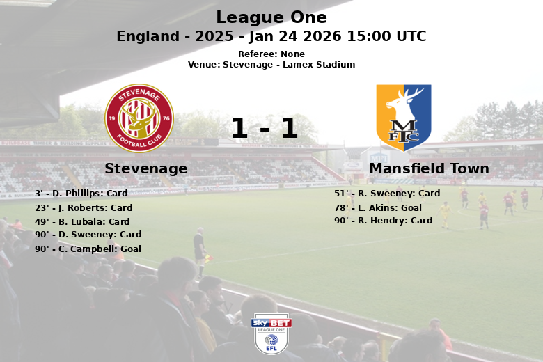 El Mansfield Town, por su parte, apostó por un juego más directo y logró adelantarse en el marcador al minuto 78 con un gol de L. Akins de penalti. Sin embargo, cuando parecía que la victoria se iba para el Mansfield Town, C. Campbell anotó un gol para el Stevenage en el minuto 90, rescatando un punto para el equipo local. El Stevenage mostró persistencia hasta el final, aprovechando su última oportunidad para igualar el marcador.