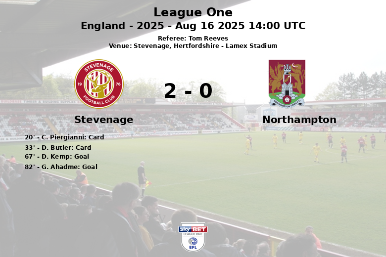 El Stevenage dominó en tiros a puerta (3 a 0), mientras que el Northampton tuvo más tiros desviados (5 a 3). Los corners también favorecieron al Northampton (6 a 2), pero la efectividad del Stevenage fue determinante para llevarse los tres puntos. El encuentro finalizó con un total de 13 faltas cometidas por el Stevenage y 15 por el Northampton.