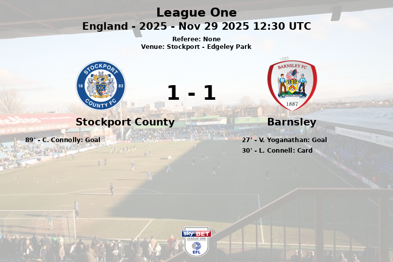 Stockport, Inglaterra – En un partido disputado en Edgeley Park, Stockport County y Barnsley igualaron en un encuentro correspondiente a la jornada 18 de la League One. Barnsley se adelantó en el marcador al minuto 27 gracias a un gol de V. Yoganathan, asistido por R. Cleary. El primer tiempo finalizó con una ventaja mínima para los visitantes y una tarjeta amarilla para L. Connell del Barnsley al minuto 30.