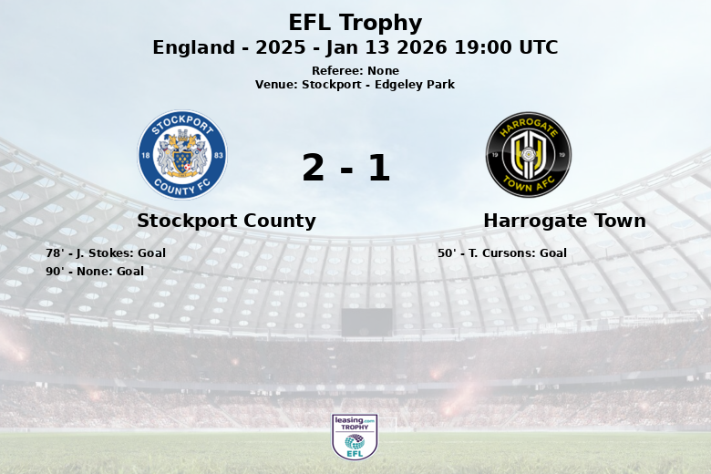 El Harrogate Town se adelantó en el marcador al minuto 50 gracias a un gol de T. Cursons, asistido por J. Muldoon, aprovechando una de las pocas oportunidades generadas. El Stockport, pese a su dominio territorial y un total de 16 tiros, solo logró inquietar la portería rival en contadas ocasiones.