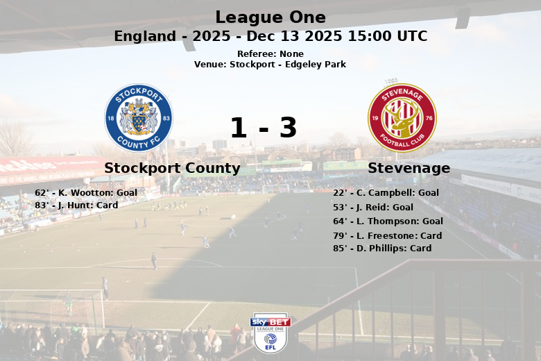 El Stevenage se adelantó en el minuto 22 con un gol de C. Campbell, asistido por L. James-Wildin. Ya en la segunda mitad, J. Reid amplió la ventaja en el minuto 53, nuevamente con asistencia de James-Wildin. El Stockport County reaccionó y K. Wootton descontó en el minuto 62, gracias a un pase de O. Dodgson. Sin embargo, la alegría local duró poco, ya que L. Thompson marcó para el Stevenage en el minuto 64, sentenciando el encuentro.