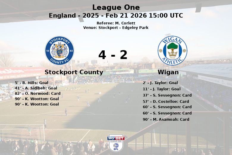 El encuentro comenzó con un ritmo frenético. J. Taylor adelantó al Wigan a los 2 minutos, pero la alegría duró poco. B. Hills empató para el Stockport en el minuto 5, asistido por O. Norwood. Taylor volvió a poner por delante al Wigan en el 11′, pero el Stockport no se amilanó y A. Sidibeh igualó las acciones en el 41′, con asistencia de J. Diamond.