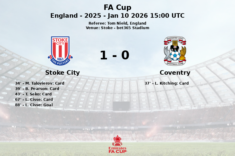 A pesar de la superioridad del Coventry en la posesión y un mayor número de tiros, el Stoke logró concretar la oportunidad más clara del partido. En el minuto 88, L. Cisse, sin asistencia aparente, anotó el único gol del encuentro, desatando la euforia en la afición local. El Stoke generó 13 disparos, de los cuales 3 fueron a puerta, mientras que el Coventry solo logró un tiro a puerta de sus siete intentos. El Stoke también superó al Coventry en corners, 7 a 3. El árbitro Tom Nield tuvo un papel activo, sancionando un total de 19 faltas durante el encuentro.