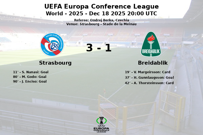Strasbourg, 18 de diciembre de 2025 – En un partido disputado en el Stade de la Meinau, el Strasbourg se llevó la victoria frente al Breidablik en la UEFA Europa Conference League. El equipo local dominó la posesión del balón con un 72%, reflejando su control del juego.