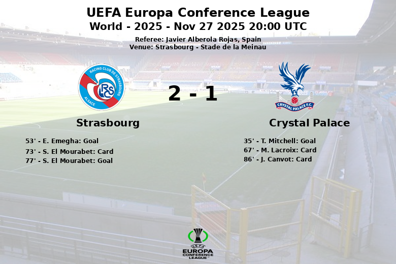 E. Emegha igualó el marcador para el Estrasburgo en el minuto 53, con asistencia de D. Moreira. El partido continuó con intensidad, marcado por varias tarjetas amarillas para ambos lados. Finalmente, S. El Mourabet le dio la ventaja al equipo local en el minuto 77, con asistencia de J. Enciso. El Crystal Palace no se rindió y luchó hasta el final, consiguiendo asegurar el empate.
