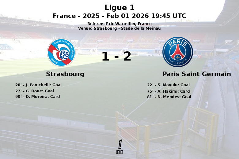 Strasbourg, Francia – En un vibrante encuentro disputado en el Stade de la Meinau, el Strasbourg y el Paris Saint Germain igualaron en un partido cargado de emociones y alternativas. El Strasbourg se adelantó en el marcador gracias a un gol de J. Panichelli en el minuto 20, tras fallar un penalti y aprovechar el rechace, con asistencia del mismo Panichelli. El PSG reaccionó rápidamente, con S. Mayulu anotando en el minuto 22 gracias a una asistencia de B. Barcola. Los locales volvieron a tomar la delantera en el minuto 27 con un tanto de G. Doue, asistido por B. Chilwell.