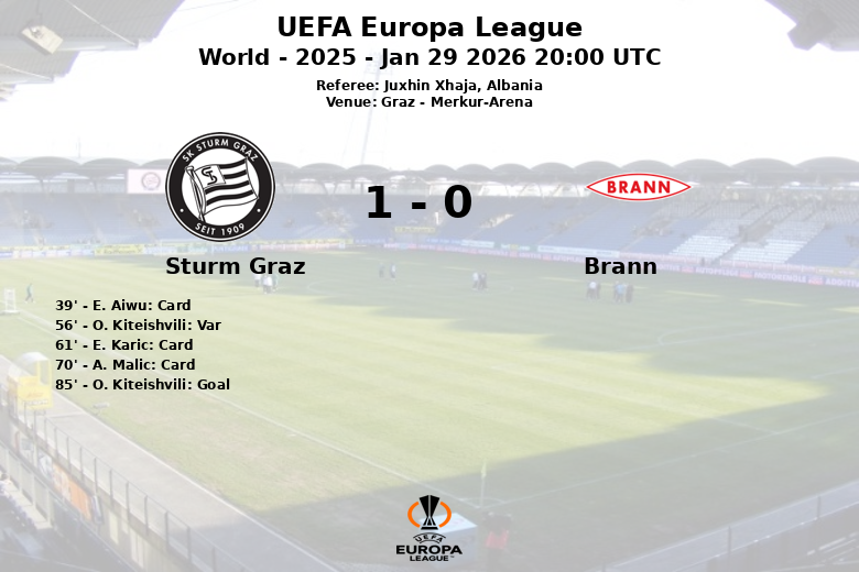 Finalmente, en el minuto 85, O. Kiteishvili logró romper el empate con un gol que, esta vez sí, subió al marcador, desatando la alegría en la Merkur-Arena. A pesar de los intentos del Brann por igualar, el Sturm Graz supo defender su ventaja hasta el final. El árbitro albanés Juxhin Xhaja dirigió el encuentro.