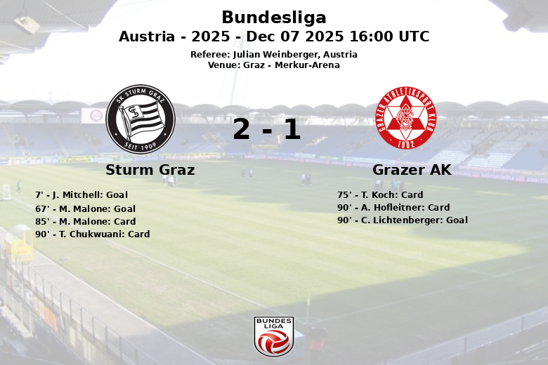 Graz, Austria – En un electrizante derbi disputado en el Merkur-Arena, el Sturm Graz derrotó al Grazer AK en un partido correspondiente a la jornada 16 de la Bundesliga austriaca. El encuentro, arbitrado por Julian Weinberger, se caracterizó por una alta intensidad y varias acciones destacadas.