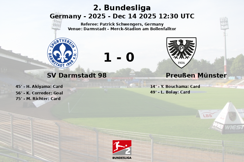 Darmstadt, Alemania – En un partido correspondiente a la jornada 16 de la 2. Bundesliga, el SV Darmstadt 98 se impuso al Preußen Münster con un marcador de 1-0 en el Merck-Stadion am Bollenfalltor. El encuentro, arbitrado por Patrick Schwengers, fue notablemente disputado, caracterizado por una alta posesión del balón por parte del Preußen Münster (68%) frente al 32% del Darmstadt.