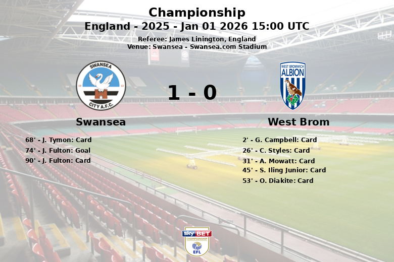Swansea, Inglaterra – En un partido disputado en el Swansea.com Stadium, el Swansea se impuso al West Brom con un gol de Jay Fulton al minuto 74. El encuentro, correspondiente a la jornada 25 de la Championship, estuvo marcado por una alta posesión de balón a favor del Swansea (59%) y un festival de tarjetas amarillas, especialmente para el West Brom.