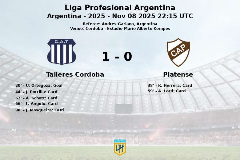 Córdoba, Argentina – En un encuentro disputado en el Estadio Mario Alberto Kempes, Talleres de Córdoba venció a Platense en un partido que se definió por la mínima diferencia. El único gol del partido llegó al minuto 20, gracias a una excelente definición de U. Ortegoza tras una asistencia de L. Angulo.