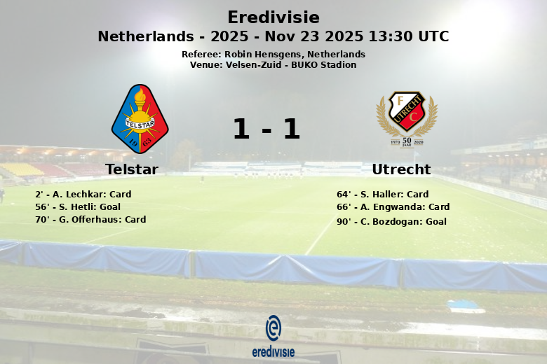 La insistencia del Utrecht dio sus frutos en el tiempo de descuento, cuando C. Bozdogan, asistido por A. Engwanda, logró batir al portero del Telstar y sellar el empate definitivo.
