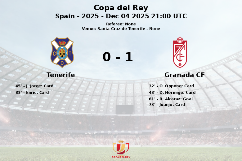 Santa Cruz de Tenerife fue testigo de un encuentro tenso y disputado entre el Tenerife y el Granada CF, correspondiente a la Copa del Rey. El partido, jugado bajo un ambiente cargado, se definió con un solitario gol de R. Alcaraz en el minuto 61, tras una asistencia de P. Saenz.