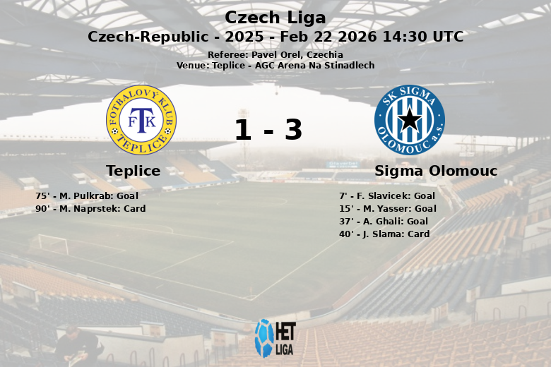 En un partido disputado en el AGC Arena Na Stinadlech de Teplice, el Sigma Olomouc se impuso con autoridad al equipo local, demostrando gran efectividad en la primera mitad. El encuentro, correspondiente a la jornada 23 de la Liga Checa, vio al Olomouc tomar la delantera rápidamente, con goles tempraneros de F. Slavicek al minuto 7 y M. Yasser al minuto 15. A. Ghali amplió la ventaja al minuto 37, con asistencia de V. Sejk, consolidando el dominio visitante.